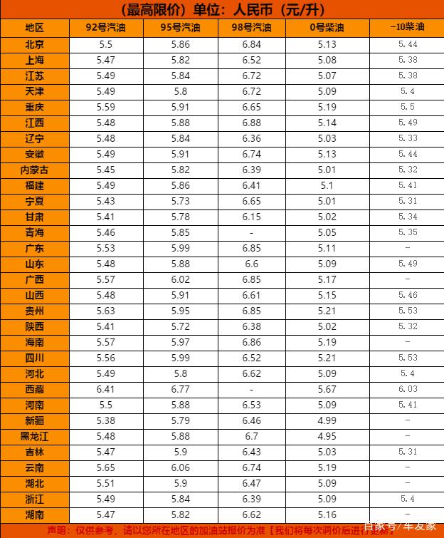 上圖是為大家整理的全國成品油最高限價一覽表,僅供參考。部分地區(qū)油價: